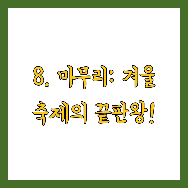 - 옷차림 : 겨울 축제인 만큼, 방한에 신경 써야 합니다. 두꺼운 외투, 모자, 장갑, 목도리는 필수! 방수 기능이 있는 옷과 신발이면 더욱 좋습니다.