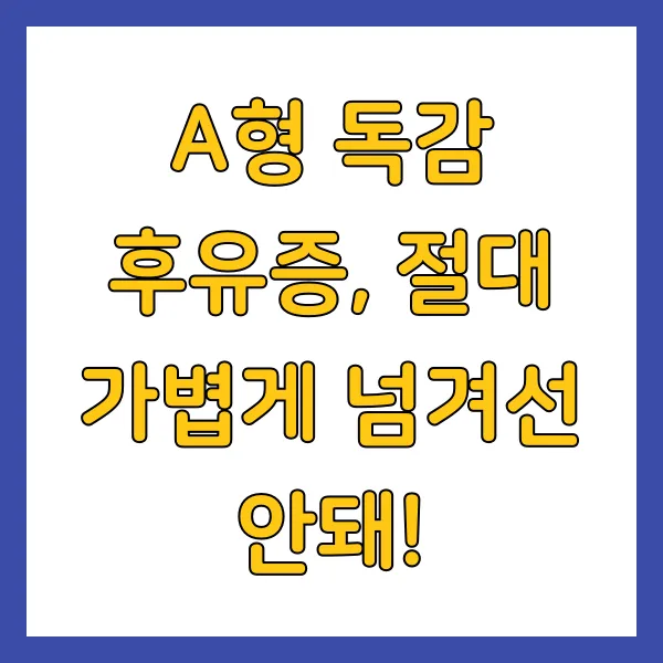 A형 독감은 대부분 특별한 합병증 없이 회복되지만, 드물게 폐렴, 기관지염, 중이염, 심근염 등의 합병증 이 발생할 수 있습니다. 특히, 어린이, 노인, 만성 질환자는 합병증 발생 위험이 높으므로 주의 해야 합니다. 또한, 독감 후유증으로 기침, 피로감, 근육통 등이 수주 또는 수개월 동안 지속될 수 있습니다. 후유증이 오래 지속되면 병원에 방문하여 적절한 치료를 받는 것이 중요합니다. 건강은 건강할 때 지켜야죠!